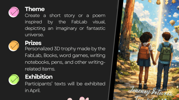 Libérez votre imagination !Le FabLab et Mme BARAY vous invitent à participer au concours d’écriture « Voyages entre deux mondes ». Créez une nouvelle ou un poème inspiré par un visuel fantastiqueLire la suite…